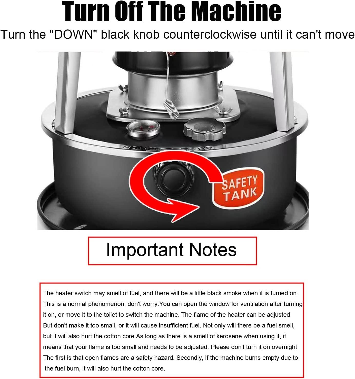 • Energy saving protection: Portable kerosene stoves do not require electricity for heating. All you need is oil and you'll have tons of heat. Don't worry about power outages when hurricanes, heavy rain and snow come. The kerosene stove has the characteristics of mute, energy saving, smokeless, clean and environmental protection. It has the functions of automatic closing of the inclination angle (anti-dip angle), automatic flameout, and hypoxia protection, which is safe and secure to use.